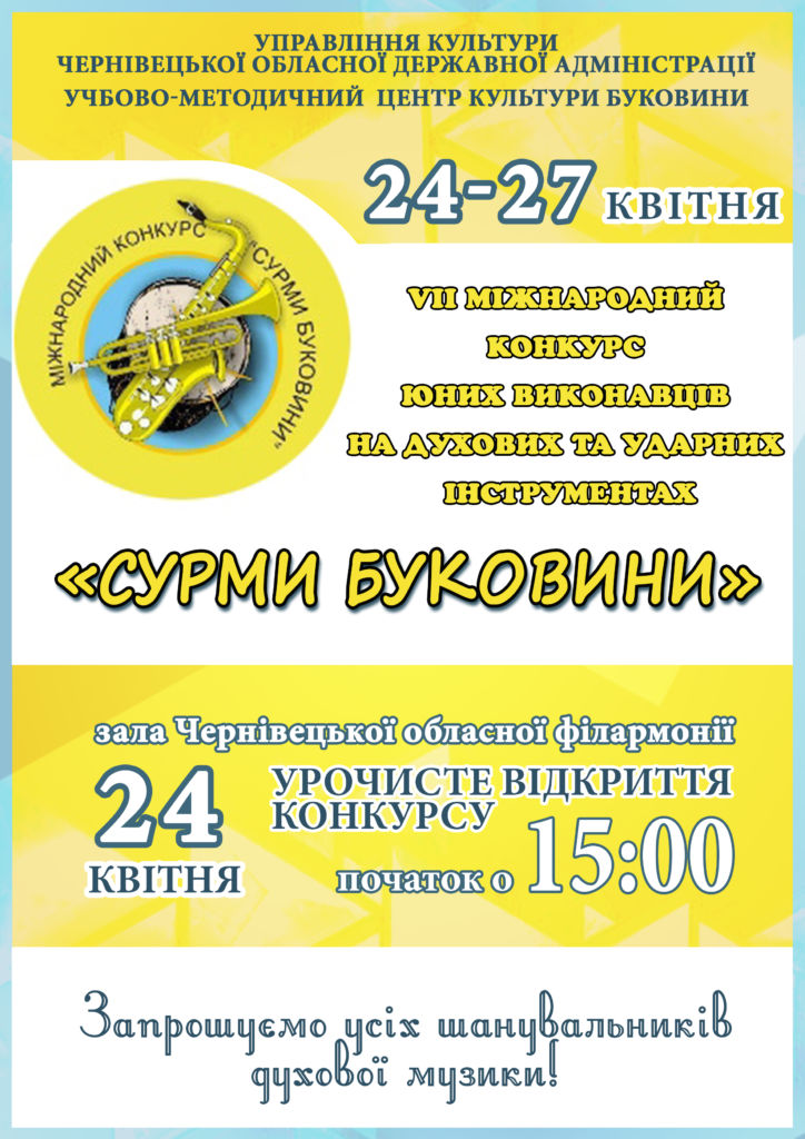 З 24 по 28 квітня столиця Буковинського краю знову прийматиме учасників та гостей VII Міжнародного конкурсу юних виконавців на духових та ударних інструментах «Сурми Буковини». Цей конкурс розпочав свою творчу діяльність у 2000 році як регіональний, згодом став Всеукраїнським, а з 2004 року отримав статус Міжнародного. У 2015 році «Сурми […]
