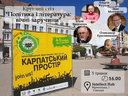 Міжнародний фестиваль «Карпатський простір» відбувася на Прикарпатті 4-6 травня, об’єднав митців з 18 країн. За три дні в Івано-Франківську відбулося понад 100 подій на 13-ти різних сценах. 5 травня в Івано-Франківську у рамках фестивалю «Карпатський простір» відбувся круглий стіл «Політика і література: вічні заручини» за участі: Андрія Куркова, Юрія Винничука, Олександра Красовицького, […]