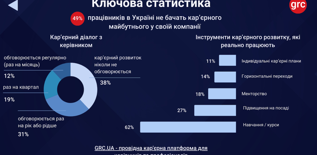 Результати опитування Експертно-аналітичний центр GRC.UA оприлюднив результати дослідження про наявність кар’єрних перспектив на українському ринку праці. Майже половина працівників в Україні не мають чіткого кар’єрного шляху у своїх компаніях, а кожен третій взагалі ніколи не обговорював розвиток із керівництвом. Опитування охопило більше 600 респондентів з усіх областей України, крім тимчасово […]