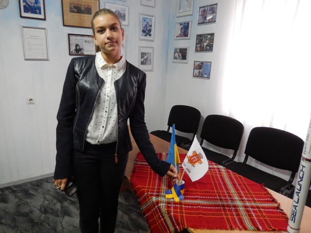 Марина Бойко, призер Всеукраїнського колоквіуму школярів в Ужгороді “Космос. Людина. Духовність” біля прапору, який побував у космосі на космічному кораблі «Space Shuttle» – «Columbia». Цей подарунок від Леоніда Каденюка передав у музей 4 жовтня 2013-го Едуард Кузнєцов під час заходів, які були присвячені Дню початку космічної ери людства.