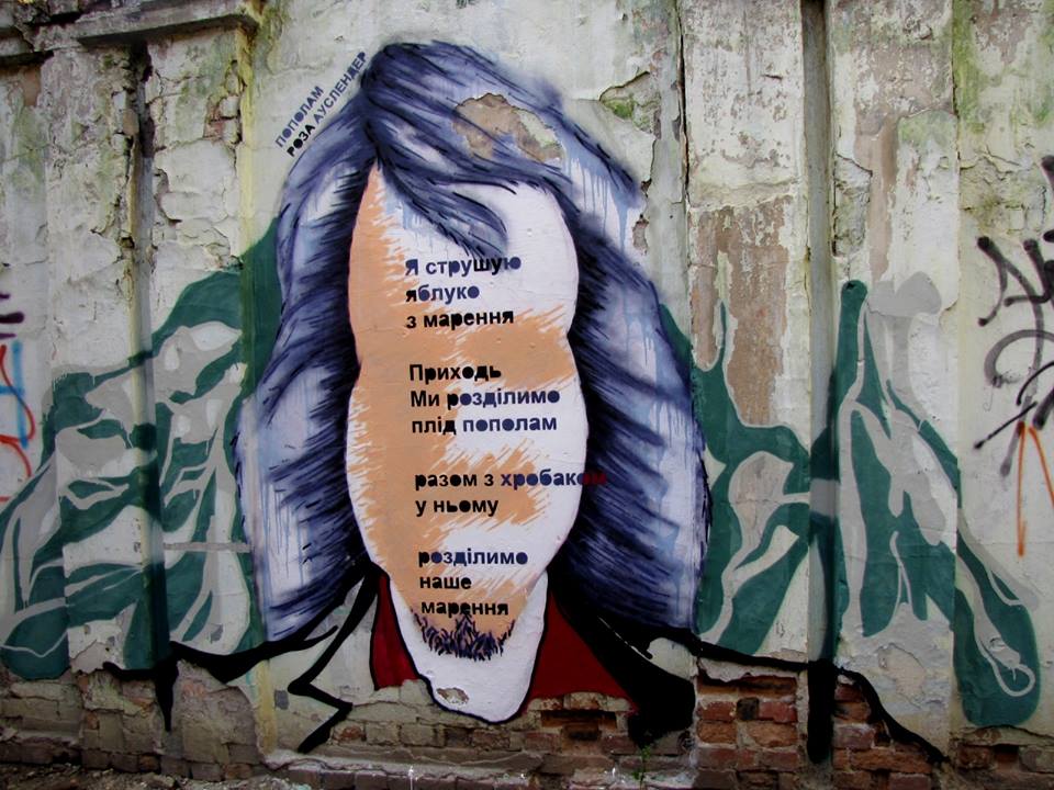 У квітні, коли сама природа приховує архітектурні недогляди і облуплені стіни міських будівель свіжорозпуклими бруньками, до прикрашання Чернівців долучилися і анонімні художники. Одразу в трьох точках старого міста – на стінах будівель по вул. Барбюса, Братів Руснаків та О.Доброго з’явилися оригінальні графіті: обличчя з написаними на них віршами чернівецьких поетів Пауля Целана та Рози Ауслендер.