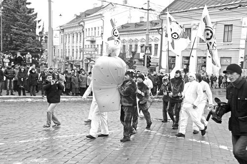 Група молодиків, одягнутих у костюми кроликів, із метровою бутафорною морквою, прапорами та шабелюками влаштували невеличкий політичний перформенс.