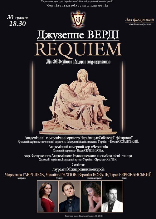 Відзначенню 200-річчя від дня народження великого італійського композитора Джузеппе Верді присвячений великий концерт у залі Чернівецької обласної філармонії, який відбудеться 30 травня, о 18.30. У програмі – «Реквієм» (1874), який композитор присвятив пам’яті видатного італійського поета Алессандро Мандзоні, а виконавці і постановники з Чернівецької філармонії – світлій пам’яті багаторічного художнього керівника Буковинського академічного заслуженого ансамблю пісні і танцю Андрія Кушніренка.