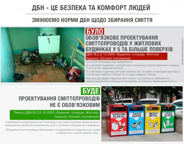 “Доки в Україні будуть обов’язково проектуватися сміттєпроводи, доти цивілізована система сортування сміття не запрацює. Сміттєпроводи у багатоповерхівках – пережиток радянського минулого, який сьогодні не має нічого спільного з відповідальним поводженням з відходами та дбайливим ставленням до екології та природи взагалі”, – написав у Facebook заступник міністра регіонбуду Лев Парцхаладзе.