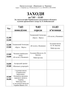 Адміністрація Центру культури “Вернісаж” (Чернівці, вул. О. Кобилянської, 53) інформує, що в закладі з 3 березня 2022 щоденно проводяться заходи для дітей переселенців з 10.00 по 18.00.