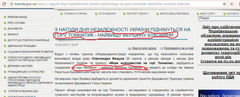 Якби цей казус трапився десь інше, може, посміялася б і забула. Але у розсилці від прес-служби ОДА про фестиваль на Томнатику від 10.08 (див. скрін-шот з сайту ОДА) у заголовку найвищою вершиною Буковини названо Томнатик, а вже у четвертому рядочку текста нас інформують про сходження на Яровицю – найвищу вершину Буковини.