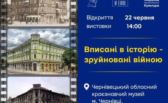 Виставка з такою назвою відкриється завтра, 22 червня о 14.00 в Чернівецькому обласному краєзнавчому музеї. Її презентує куратор напрямку «Культура» центру підтримки внутрішньо переміщених осіб “ЯМаріуполь” у місті Чернівці Наталія Арусланова. У 33-х стендах фотовиставки містяться історичні довідки та демонструються зображення найвизначніших архітектурних пам’яток Маріуполя у їхньому первинному вигляді та нинішньому, після […]