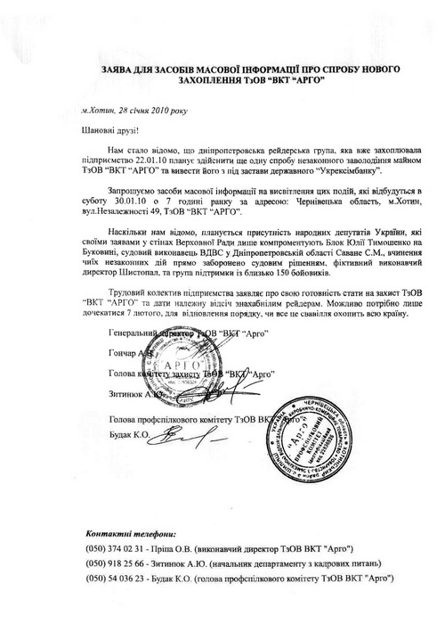 У ніч з 22 на 23 січня правозахисні органи попередили захоплення одного з найбільших українських виробників бляшаної тари – ВАТ «Виробничо-комерційне товариство «Арго» в Хотині.