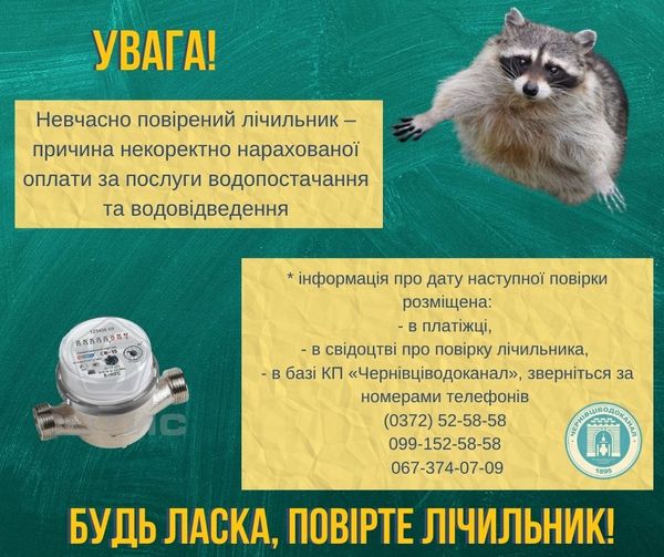 Якщо Ваш лічильник не повірений, з наступного місяця система обліку комунального підприємства «Чернівціводоканал» буде нараховувати оплату «по нормі» , тобто, до 7,5 кубів на одну людину! Станом на 18 січня в базі підприємства близько 18 000 (вісімнадцяти тисяч) лічильників обліку води, дані про повірку яких відсутні. Повірити лічильник можна […]