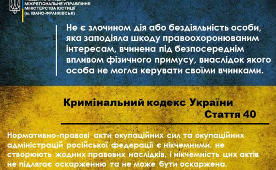 Під час війни правопорушення з примусу не є злочином, а нормативно-правові акти окупаційних сил та окупаційних адміністрацій російської федерації є нікчемними і не створюють жодних правових наслідків. У час війни можливі випадки, коли особа розуміє небезпечність своїх вчинків та їх наслідків, однак, перебуваючи під впливом сили примусу, позбавлена можливості керувати […]