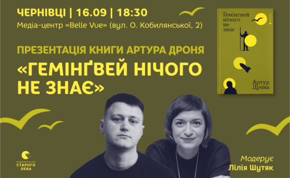 Письменник і ветеран російсько-української війни Артур Дронь презентує книгу «Гемінґвей нічого не знає» у Чернівцях У вівторок, 16 вересня, о 18:30 у Чернівцях відбудеться презентація книги письменника і ветерана російсько-української війни Артура Дроня «Гемінґвей нічого не знає». Сьогодні Артур Дронь — один із найпомітніших голосів нової воєнної літератури. Після важкого […]