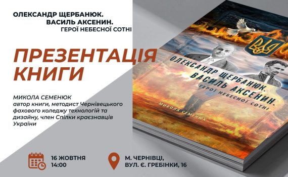 «Олександр Щербанюк. Василь Аксенин. Герої Небесної Сотні» – таку назву має книга Миколи Семенюка, презентація якої відбудеться у Чернівецькому фаховому коледжі технологій та дизайну. Це книга–реквієм, присвячена вона учасникам Революції Гідності Олександру Щербанюку та Василю Аксенину, які віддали найцінніше – своє життя – заради євроінтеграційного вибору України. Книга складається з […]