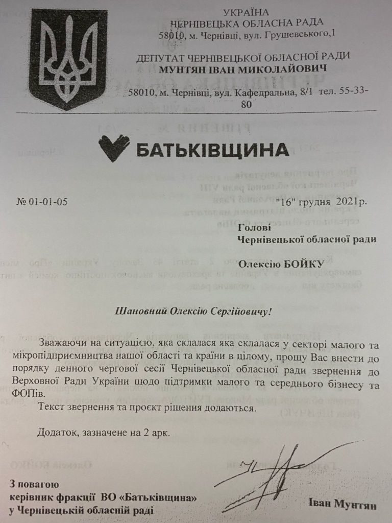 Також і буковинська «Батьківщина» ініціювала звернення до Верховної Ради щодо підтримки малого та середнього бізнесу та ФОПів