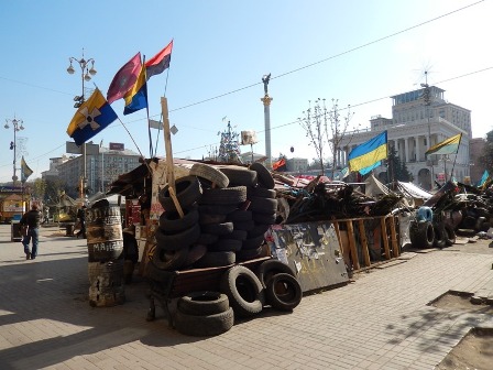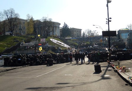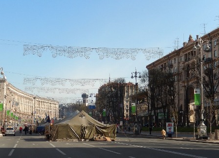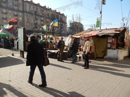 Десь я прочитала, що зараз на Київському Майдані ще стоять майже 100 наметів. Але здається, що більше. Залишилися також і барикади з мішків, шин, цегли. Біля наметів димлять бочки, люди продовжують колоти дрова, збирають пожертви, самі готують їжу.