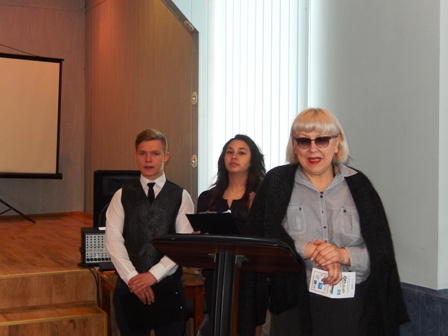 Назар Проданюк і Дарина Зарайська, члени клубу “Біт” і Тетяна Спориніна зачитують вітальні листи учасникам конференції