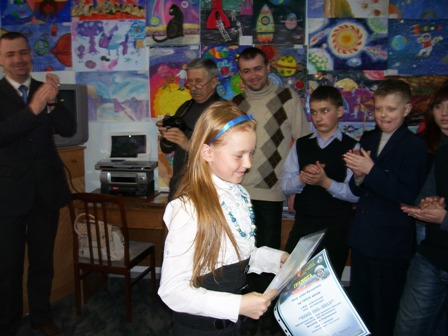 Олег Бурега, Вадим Гузуватий, Іван Корнецький, Богдан Гарасимчук, 13 років, “Космічна ракета”, ЗОШ №38Анастасія Гросу, 7 років, “Ми у космосі”, ЧМПДЮЛюбов Кульчицька, 17 років, “Космічний сон Валентини”, ЗОШ №30, ШНТ “Сігма”Переможців вітають В.Г. Каденюк, Голова правління МЦ УМАКО «Сузір’я»; Л.В. Компаневич, директор КЮТ «Кварц»; Федик М.В., методист ММК управління освіти Чернівецької міської ради