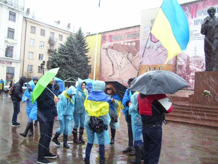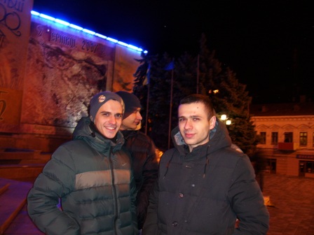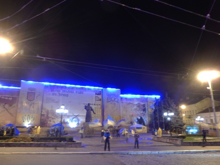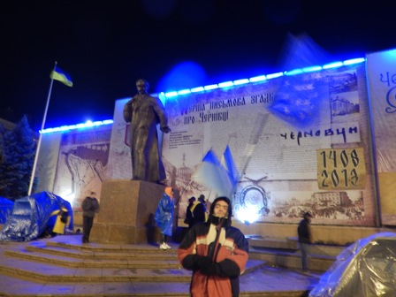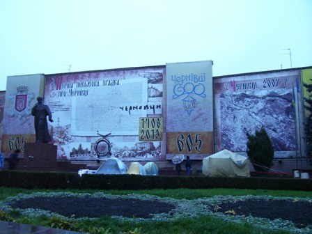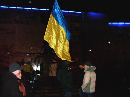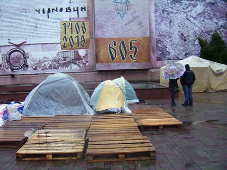 25.11.2013. Чернівчани, здебільшого студенти, на Центральній площі продовжують протестувати проти припинення Україною курсу на євроінтеграцію. Сьогодні досить складні погодні умови, особливо зранку і вдень, дощ, сніг… Встановлені намети. Дехто приносить продукти, печиво, цукерки, допомагають і грошима. Настрій позитивний.