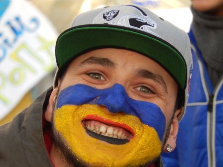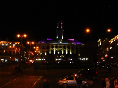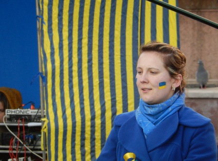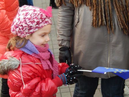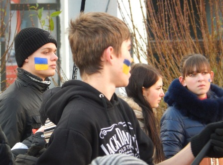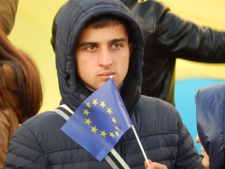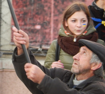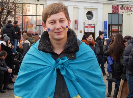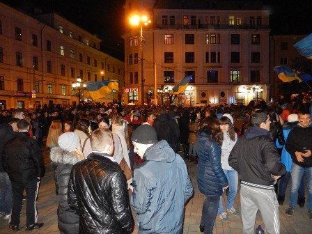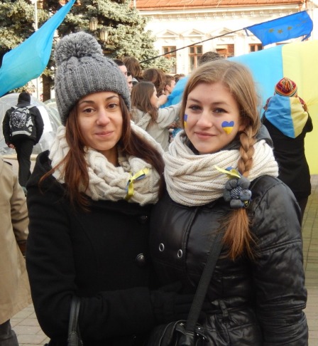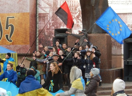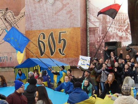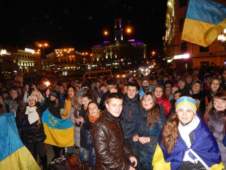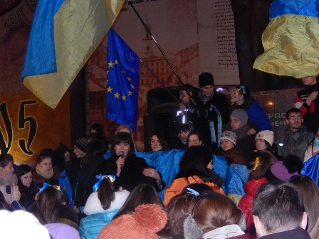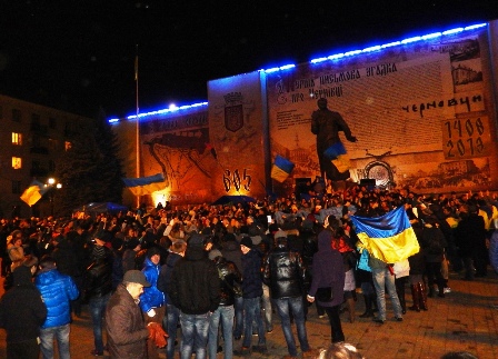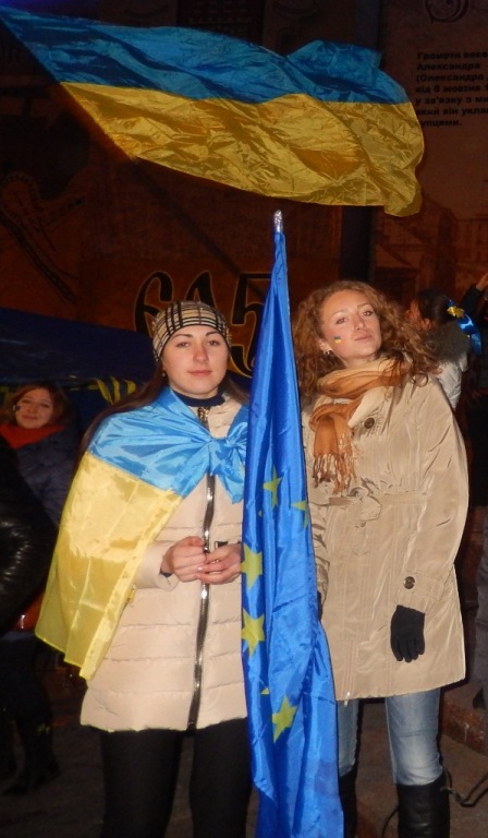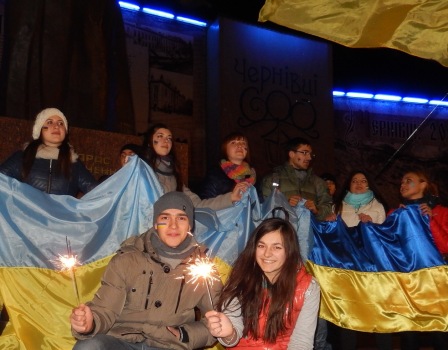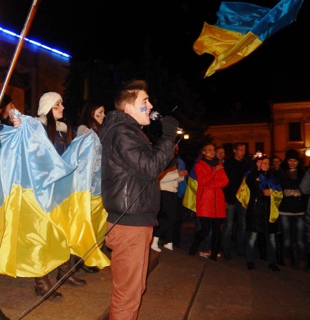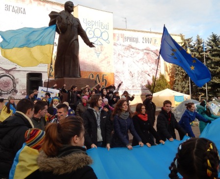 28.11.2013. Прапор ЕС на міськраді. Чернівчани, здебільшого студенти, на Центральній площі продовжують підтримку євроінтеграційного вибору. Лунає музика, виступють активісти, перехожі, викладачі, музиканти… Люди співають, вигукують гасла, танцюють ( і через холодину) та вірять у світле майбутнє України. Настрій ще позитивний.
