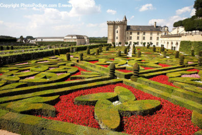 Трирівневі квітникові сади, розділені самшитовими і чагарниковими «кулісами», всередині яких різної форми та висоти зелені насадження. «Верхній рівень» уособлює «Дзеркало водного басейну» («місце насолоди музичним звучанням водної стихії Життя»). «Середня тераса» садово-паркових композицій розвивається на рівні перших поверхів палацових будівель, уособлюючи цим філософську силу «Саду Любові». Тому сакральний зміст її духовних цінностей підкреслюється сходами в обрамленні декоративних ваз. «Нижній ярус» – це райський «Сад-квітник Насолод», наповнений духмяністю прянощів та квітів «аптекарського саду»…