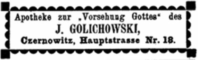 Аптекар Юзеф Голіховський (1836, Теребовля, Тернопільська область – 1894, Чернівці) за освітою був фармацевтом, мав ступінь магістра. Його аптека часто згадувалася в чернівецьких та інших австро-угорських друкованих джерелах і була доволі популярною. 1882 року на свій 15-річний ювілей аптека отримала назву «Vorsehung Gottes» («Провидіння Боже», в перекладі з німецької часто зустрічається «Під провидінням Божим»).