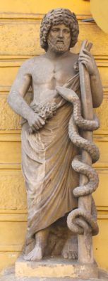 Ліворуч – відомий бог здоров’я і медицини Асклепій, праворуч – одна з його дочок – цілителька Панацея (грецькою – Панакея: «лікує все»)