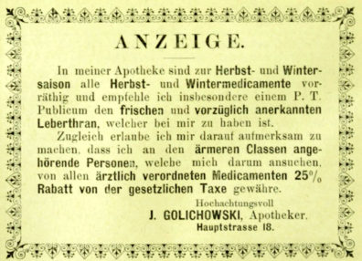 «У моїй аптеці є всі осінньо-зимові ліки. Я особливо рекомендую Liberthran – свіжий і добре визнаний риб’ячий жир з печінки тріски, який є в мене. При цьому дозволяю собі прислухатися до людей бідніших класів, які мене просять про 25% знижку на медичні препарати.