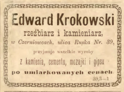 Наприклад, газета «Przegląd Czerniowiecki» в перших числах 1883 року подала оголошення і рекламу про приймання замовлень наступного змісту: «Едвард Кроковський різьбяр і каменяр, у Чернівцях, вулиця Руська №39, приймає (замовлення на) різноманітні вироби з каменя, цементу, мозаїки й гіпсу за поміркованими цінами».