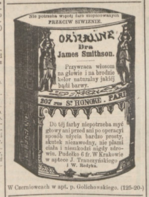 Реклама аптеки Голіховського. Фарба для волосся. «Czas» 1876 року