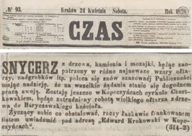 «Різьбяр по дереву, каменю та мозаїці, який виконує різне найновіше оформлення вівтарів, надгробків тощо знову повідомляє шановній публіці, що виконує витвори для будь-яких потреб. Я й досі в Копичинцях Чортківського повіту, де я працюю над створенням великого дерев’яного вівтаря для Баришівського костелу.