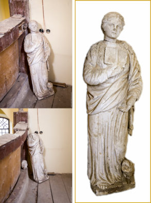 На одному з фото – торс і голова на підлозі. На другому бачимо цей жіночий тулуб з приставленою до нього головою. Перед нами – скульптурне зображення святої мучениці. Біля її ноги вирізьблений дракон як уособлення зла, а на грудях відкрита книга.