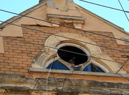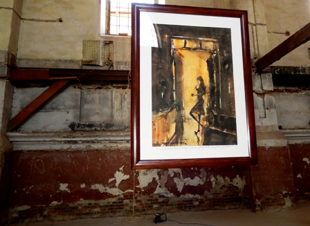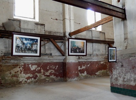 Виставковий простір – ніби декорація якогось постановочного перформансу: розбиті вікна, тріщини, сліди згарищ, фрагменти іудейських текстів на стінах, яскраві промені, сонячні плями крізь розбиті шибки…