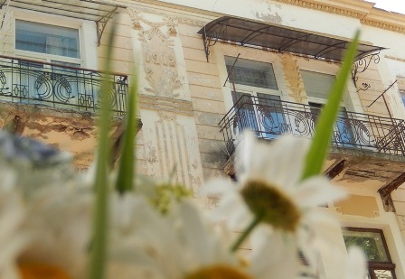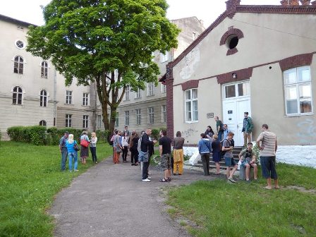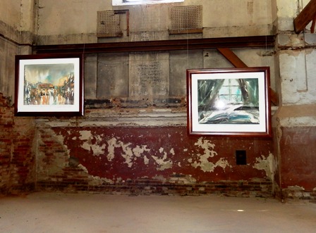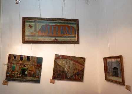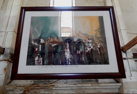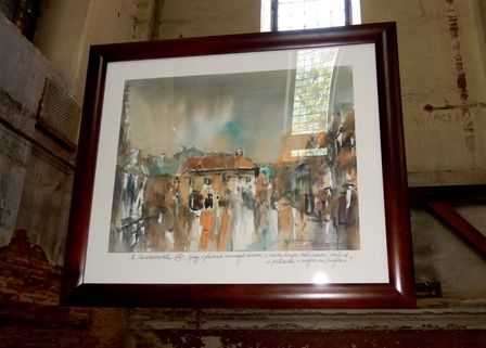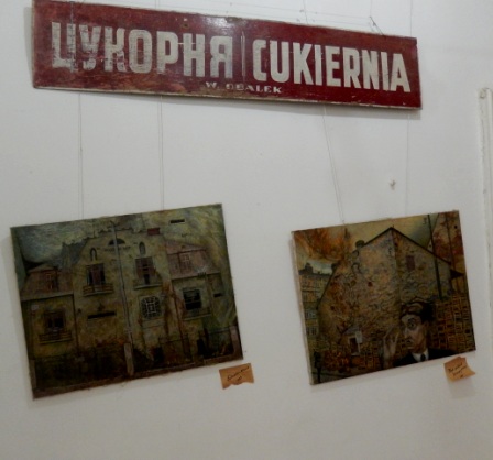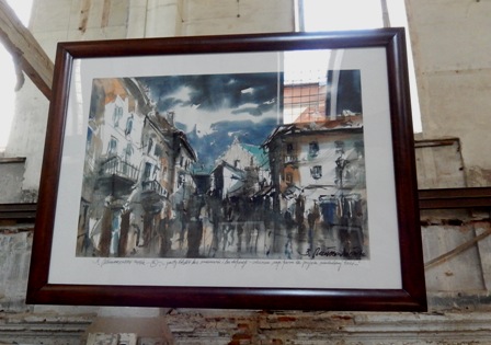 На довгих мотузках у просторі покинутої синагоги на нас дивляться прекрасні акварелі художника Міхаловського: постаті людей, відлуння міста, силуети амбітних будинків, вілл, вулиця з фіакром, площі, які може бачити птах, пролітаючи над містом… Дивують несподівані, виразні співвідношення фарб та додаткові кольори, які виникають на сірому тлі картин разом із сонячними проектованими променями від відкритих та розбитих вікон… Простір ніби рухається. Разом із часом… Відчуття єднання, перетікання разом із часом смужкою Мебіуса…