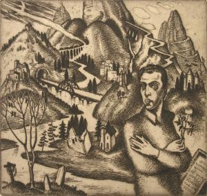 Титульний аркуш набору літографій «Буковина» (1934) з автопортретом митця