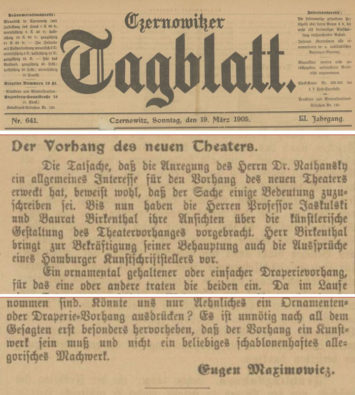 «З появою нового театру з’явився вишуканий заклад сценічного мистецтва. Він тепер міститься у нових відповідних приміщеннях. Відгуком на цю особливо важливу подію для Чернівців може стати створення постійного зображення на завісі.