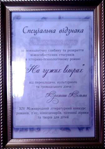 Я не знала ні звідки письменниця, ні скільки їй років, нічогісінько. Приблизно два місяці я вагалася і обирала. Хотіла нагородити роман, який би не просто сподобався мені для прочитання, а який, на мою суб’єктивну думку, мав би бути помічений виданнями, який буде гідно представляти українську літературу, який не загубиться на полиці, тобто не є для одноразового прочитання. Таким для мене став історико-психологічний роман “На чужих вітрах”. Пізніше вже дізналася, що авторкою його є львівськи письменниця Ольга Яворська. Її твір надихнув мене на вручення спецвідзнаки за психологічну глибину та розкриття міжособистісних стосунків. Якою гарною і вишуканою українською мовою написаний цей твір! І вже після церемонії я дізаналася, що пані Ольга від 1997-го є Членом національної Спілки письменників України .