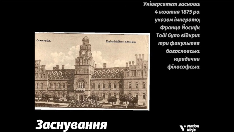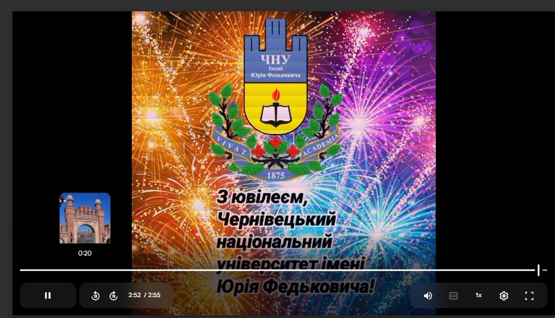 «Я планую навчатися в ЧНУ». Автор: Пилипик Артем, учень 6 класу опорного закладу «Вашківецький ЗЗСО І-ІІІ ст.»«150 років Чернівецькому національному унівеситету !». Автор: Гуменюк Олександра, вихованка гуртка «Сучасна інформатика» при ЧЦЮТ, 7-Б клас Чернівецького ліцею No19 ім. О.Кобилянської. «Вчіть предмет зараз, бо коли прийде час працевлаштовуватися, ці знання вам точно знадобляться. Якщо не вчити – потім пошкодуєте, бо можливості будуть, а навички – ні!» — Євген Давиденко, викладач ФКН ЧНУ.Автор: Олійник Вероніка, учениця 7 класу Чернівецького багатопрфільного ліцею №11. Метою мого проекту є висловлення привітань Чернівецькому національному університету з нагоди 150-річного ювілею, підкресливши його чарівну архітектуру, завдяки чому і носить неофіційну назву «Чернівецький Гоґвортс»«Усе починалося з наріжного каменю…». Автор: Пономарьова Дар’я, Грубнянський ліцей Сокирянської міської ради Дністровського району. Робота знята в додатку StopMotion(IOS), змонтована (відеомонтаж, аудіомонтаж, зведення) в програмі Final Cut Pro, звукозапис виконано в програмі Audacity, у програмі Figma зроблено обробку картинок, титулка створена за допомогою програми KeyNote.
