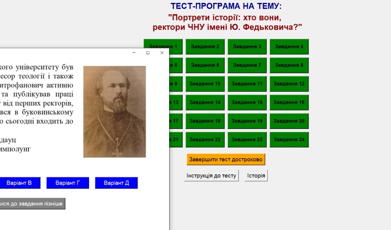 Автор: Даскалюк Марьян, учень 8-Б класу Опорного закладу Сторожинецький ліцей. Програма «Портрети історії…» реалізована на мові Python 3 з використанням бібліотек tkinter (для графічного інтерфейсу), Pillow (для обробки зображень) та json (для роботи з базою історії).