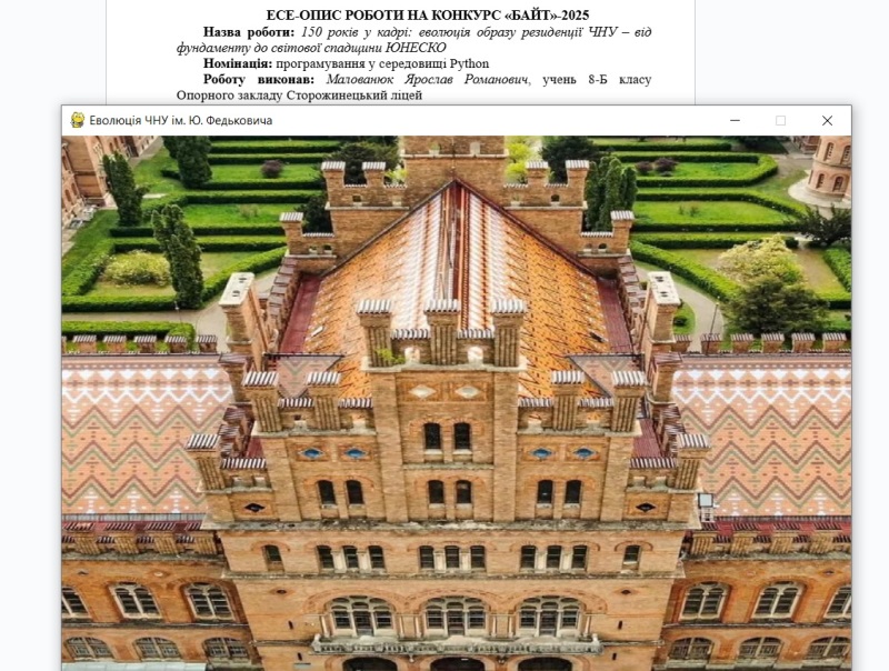 Конкурс «Байт» уже традиційно стає майданчиком для відкриття нових талантів — дітей, які мислять творчо, сучасно й технічно. Їхні роботи демонструють не лише знання комп’ютерних технологій, а й любов до рідного краю та повагу до історії Чернівецького національного університету — духовного й наукового центру Буковини.