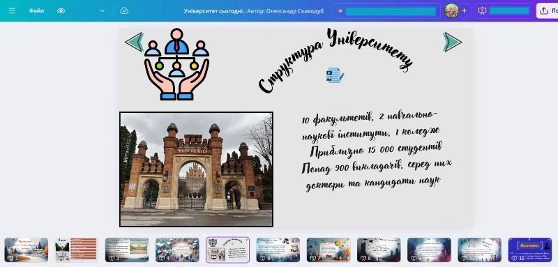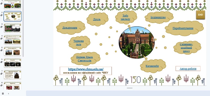«Цікаві факти з історії ЧНУ». Автор: Майстер Назар, учень 6 класу Шишковецького ліцею Вашковецької ТГ Дністровського району Чернівецької області. Методами мого дослідження було середовище створення презентацій Microsoft Power Point, власна фантазія та фото з інтернету, за допомогою яких я намагався розповісти про дану тему«Університет сьогодні». Автор: Скакодуб Олександр, учень 6-А класу Новодністровського ОЗЗСО «Новодністровська гімназія»