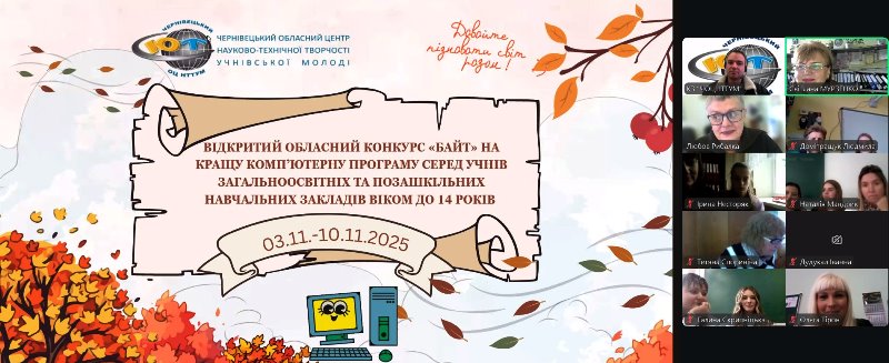 Від 3 до 10 листопада 2025 року відбувся відкритий обласний конкурс «Байт» на кращу комп’ютерну програму серед учнів закладів загальної середньої та позашкільної освіти Чернівецької області віком до 14 років. Організатор конкурсу – Чернівецький обласний центр науково-технічної творчості учнівської молоді.
