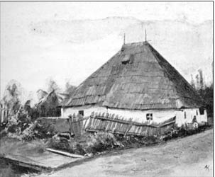 Відходили в минуле й курні хати без димарів, одну з таких бачимо на малюнку Августи Кохановської (стор. 36).