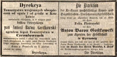 Краківське товариство взаємного страхування 1868 року призначило своїм агентом у Чернівцях пана Антоні барона фон Гостковського, про що дізнаємося з оголошення, розміщеного у часописі «Czernowitzer Zeitung» від 26 липня 1868 року. В тексті зазначено, що його канцелярія розміщена в Чернівцях на вулиці Львівській у будинку пана Прункула.