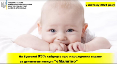 У лютому на Буковині  95 % свідоцтв про народження дітей батьки немовлят отримали  скориставшись комплексною послугою «єМалятко». Це швидко та зручно.
