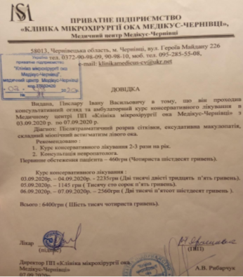 Внаслідок нанесених мені тілесних ушкоджень, я втратив 40-60% зору у лівому оці та перебував на лікуванні з діагнозом: «Післятравмаційний розрив сітківки лівого ока». Мені довелося лікуватись, а попереду на мене ще чекає операція на ліве око, вартість якої понад 10 тис. грн. Вона потрібна для того, щоби зберегти хоча б ті 40-60% гостроти зору, яка у мене залишилась.