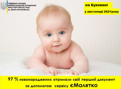 Отож, у листопаді 2021 року в Чернівецькій області свідоцтво про народження дитини за допомогою комплексної послуги «єМалятко» отримали 405 новонароджених дівчаток і хлопчиків. Як зазначають у відділі державної реєстрації актів цивільного стану у Чернівецькій області, ця цифра становить 97% від загальної кількості виданих свідоцтв про народження.