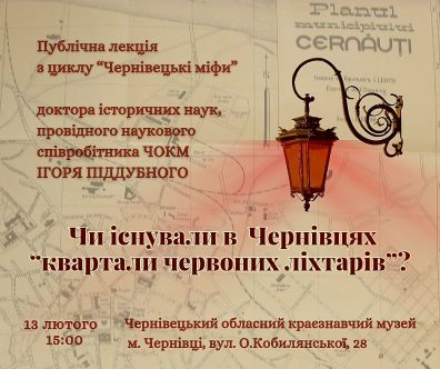 А як щодо «прихованих» сторінок соціального життя? Чи були такі?! Безперечно, хоча б той же квартал так званих червоних ліхтарів. І про це можна буде дізнатися вже цього четверга, 13 лютого, о 15:00 у Чернівецькому обласному краєзнавчому музеї. Саме там відбудеться публічна лекція доктора історичних наук, провідного наукового співробітника ЧОКМ Ігоря Піддубного.
