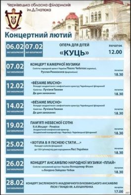 Як ви бачите з нашого анонсу, шановні поціновувачі класичного та традиційного українського мистецтва, концертний лютий увібрав усі ваші побажання та відобразив усі музичні смаки. Тому з великою надією та радістю очікуємо вас у залі філармонії на наших концертах. Сподіваємося, що після такої довгої розлуки кожен з Вас, виходячи із зали, ні на секунду не пошкодує, що провів свій зимовий вечір саме з нами, артистами Чернівецької обласної філармонії.