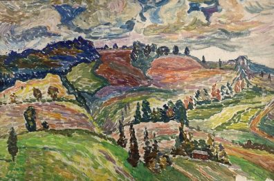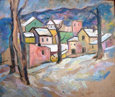 Іншим разом він вдається до зміни манери зображення заради настроєвості або виразності звучання пейзажу: пригашує інтенсивність кольорів і прокладає їх розлогими широкими мазками, а форми акцентує чорними контурними лініями. Йдеться про композиції з будинками на тлі гірського пейзажу (“Вид на Чернівці”) та “Турецький міст”, а також “Карпатський краєвид” 1969 року, який хвилює експресивністю динамічних рухів пензля і кольорів.