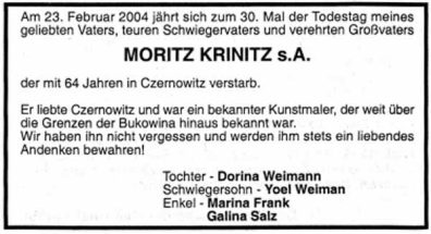 “23 лютого 2004 року виповнюється 30 років від дня смерті мого улюбленого батька, дорогого свекра та шановного дідуся Моріца Криніца, який у віці 64 років