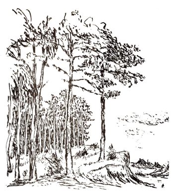 Вертикальні тверді й міцні лінії їхніх стовбурів, які нанесені з притиском, контрастують з легкими м’якими мереживними штрихами крон дерев та їхнім ледь чутним шепотінням.